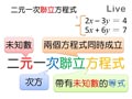 例 $\begin{cases} 2x-3y=4 \\ 5x+6y=7 \end{cases}$ 稱為二元一次聯立方程式